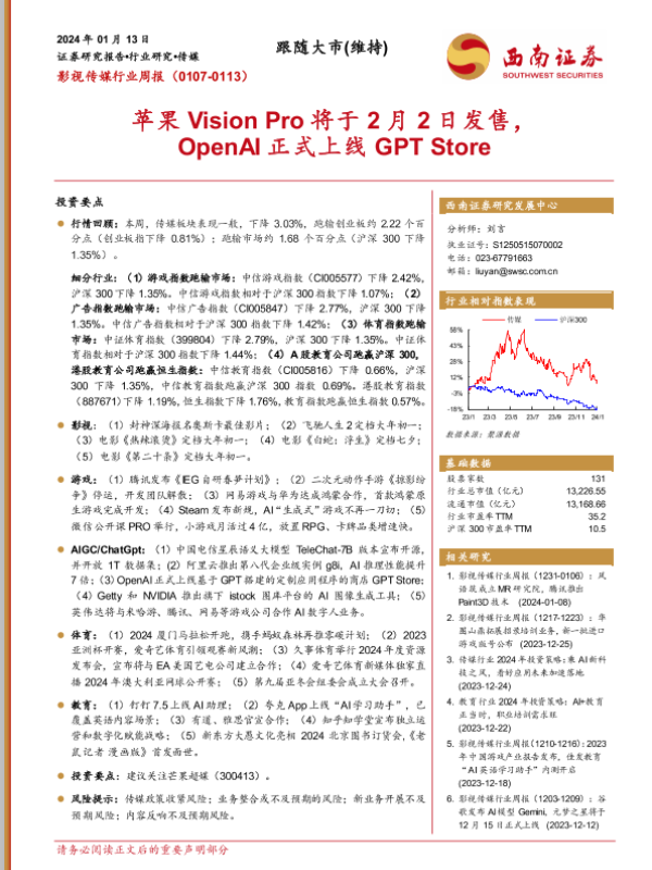 【西南证券】【20240113】影视传媒行业周报:苹果Vision Pro将于2月2日发售,OpenAI正式上线GPT Store-21页 行业研究