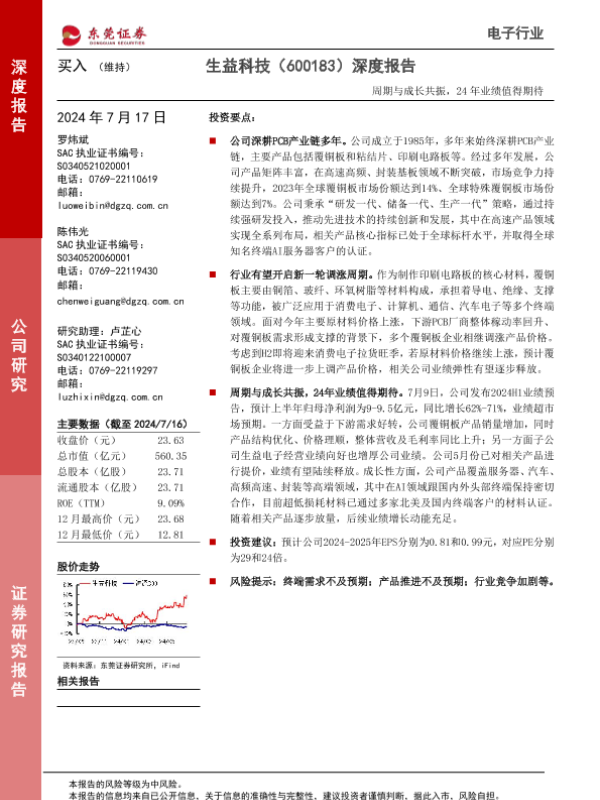 【东莞证券】【20240717】20240717-东莞证券-生益科技-600183.SH-深度报告:周期与成长共振,24年业绩值得期待-20页 行业研究