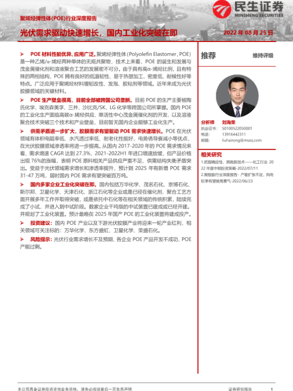 【民生证券】【20220825】聚烯烃弹性体(POE)行业深度报告-42页 行业研究
