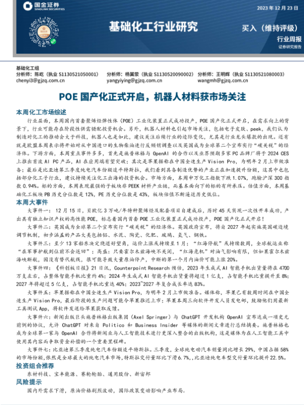 【国金证券】【20231221】国金证券:基础化工行业研究-POE国产化正式开启-机器人材料获市场关注-24页 行业研究