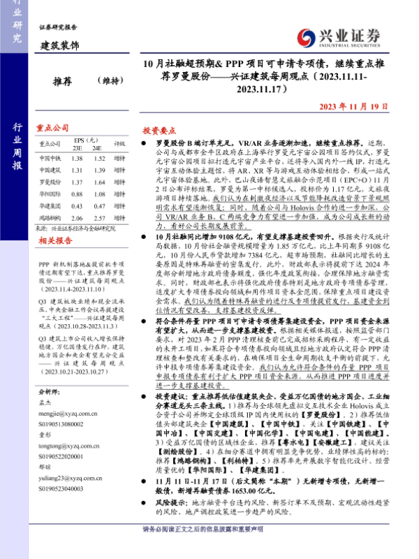 【兴业证券】【20231119】10月社融超预期&PPP项目可申请专项债,继续重点推荐罗曼股份-31页 行业研究