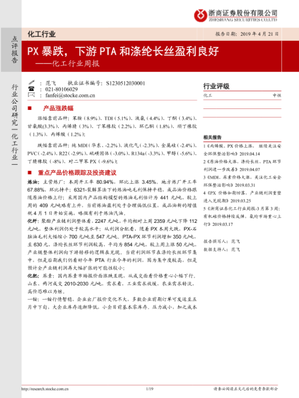 【浙商证券】【20190421】20190421-浙商证券-化工行业周报:PX暴跌,下游PTA和涤纶长丝盈利良好-19页 行业研究
