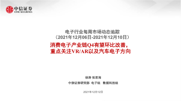 【中信证券】【20211212】电子行业每周市场动态追踪:消费电子产业链Q4有望环比改善,重点关注VR AR以及汽车电子方向-21页 行业研究