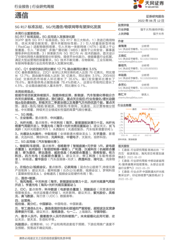 【天风证券】【20220612】20220612-天风证券-通信行业研究周报:5G R17标准冻结,5G 光通信 物联网等有望深化发展-12页 行业研究
