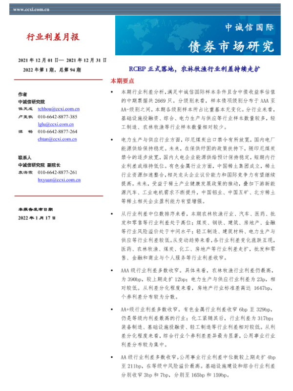 【中诚信国际】【20220117】行业利差月报:RCEP正式落地,农林牧渔行业利差持续走扩-15页 行业研究