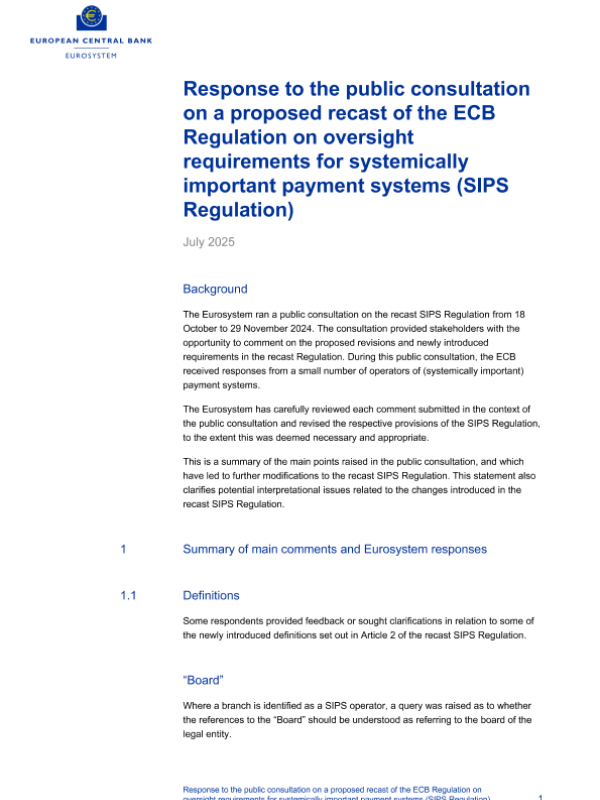 【European Central Bank】【202507】Response to the public consultation on a proposed recast of the ECB Regulation on oversight requirements for systemically important payment systems (SIPS Regulation)-6页 政策文件