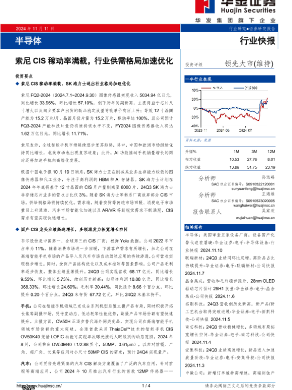 【华金证券】【20241220】半导体:索尼CIS稼动率满载,行业供需格局加速优化-4页 行业研究
