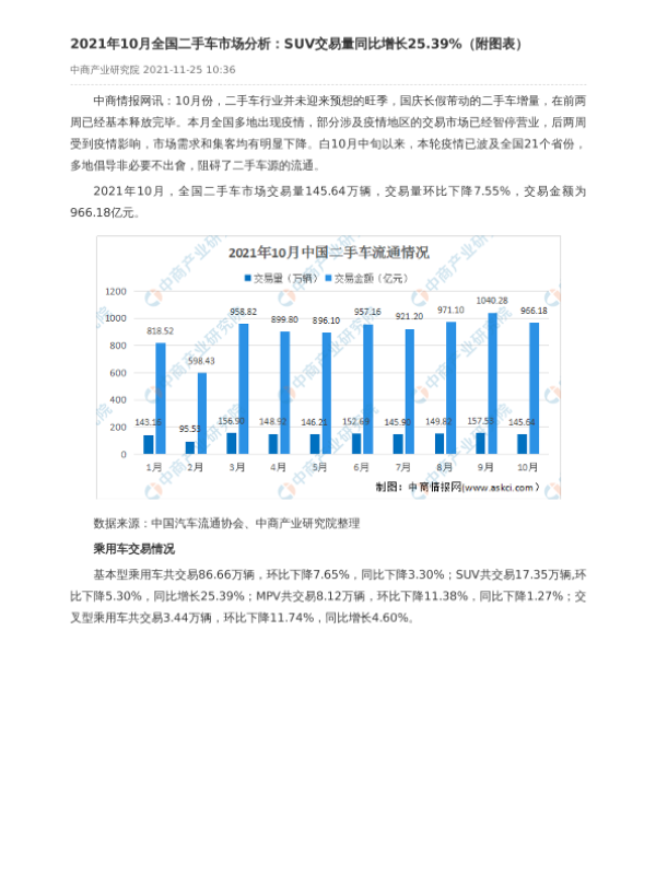 【中商产业研究院】【202110】2021年10月全国二手车市场分析-2页 市场调研