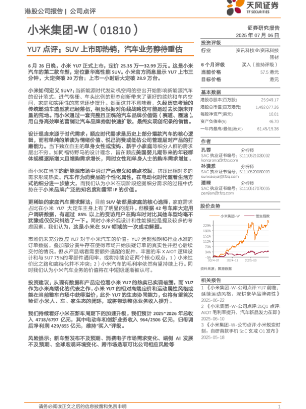 【天风证券】【20250706】YU7点评:SUV上市即热销,汽车业务静待重估-2页 证券期货研究报告