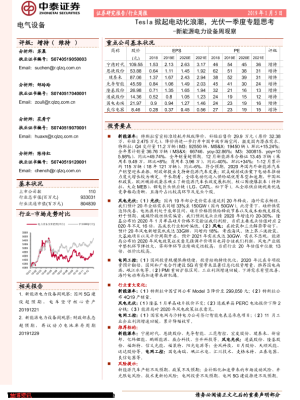 【中泰证券】【20200105】20200105-中泰证券-新能源电力设备周观察:Tesla掀起电动化浪潮,光伏一季度专题思考-20页 行业研究
