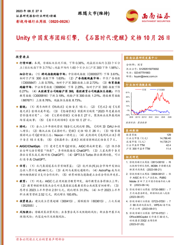 【西南证券】【20230827】影视传媒行业周报:Unity中国发布团结引擎,《石器时代 觉醒》定档10月26日-19页 行业研究
