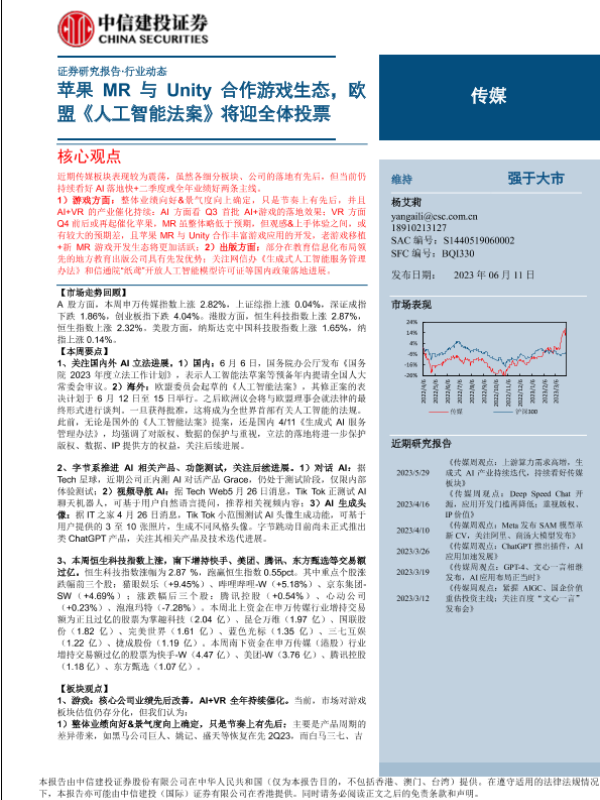 【中信建投证券】【20230611】传媒行业动态:苹果MR与Unity合作游戏生态,欧盟《人工智能法案》将迎全体投票-26页 行业研究