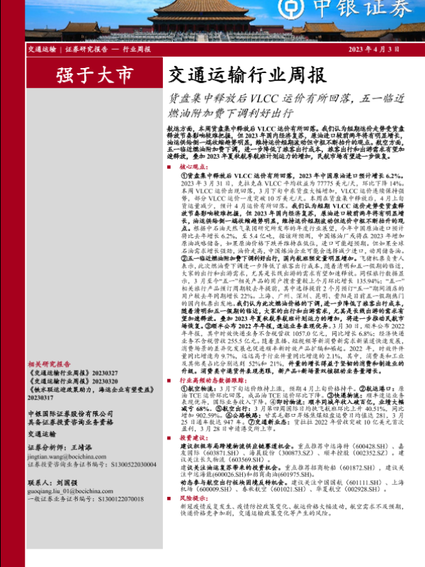 【中银证券】【20230403】交通运输行业周报:货盘集中释放后VLCC运价有所回落,五一临近燃油附加费下调利好出行-29页 行业研究