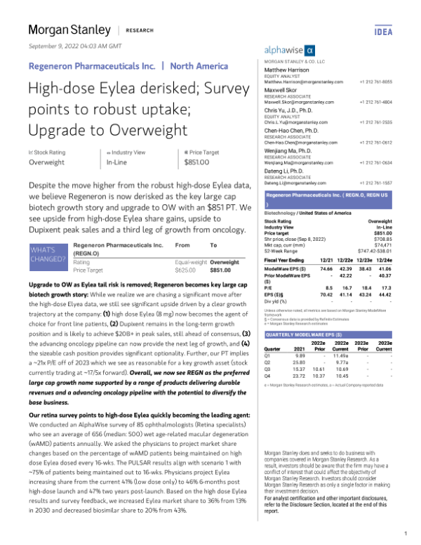 【Morgan Stanley】【20220909】Regeneron Pharmaceuticals Inc. High-dose Eylea derisked; Survey points to robust uptake; Upgrade to Overweight-52页 行业研究