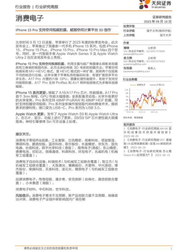 【天风证券】【20230919】消费电子行业研究周报:iPhone15 Pro支持空间视频拍摄,赋能空间计算平台3D创作-17页 行业研究