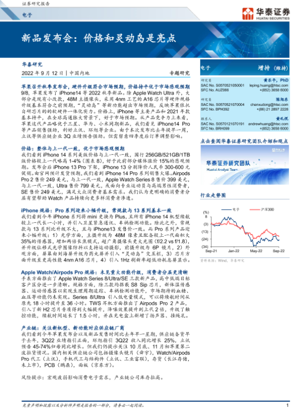 【华泰证券】【20220912】20220912-华泰证券-电子行业专题研究:新品发布会:价格和灵动岛是亮点-7页 行业研究