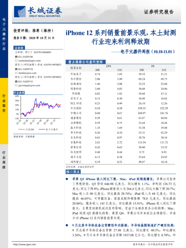 【长城证券】【20201031】电子元器件周报:iPhone 12系列销量前景乐观,本土封测行业迎来利润释放期-28页 行业研究
