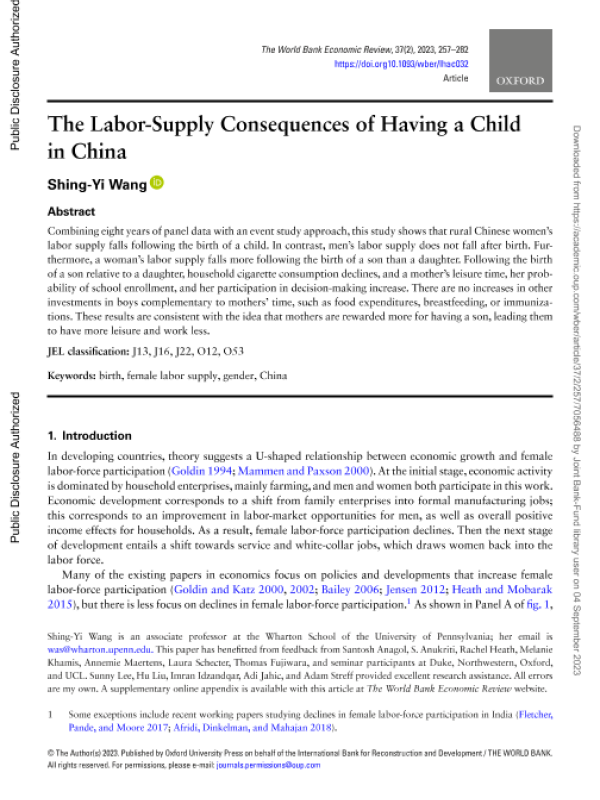 【The World Bank】【2023】The Labor-Supply Consequences of Having a Child in China-26页 学术论文