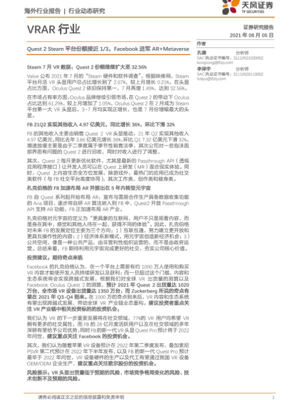 【天风证券】【20210805】VRAR行业:Quest 2 Steam平台份额接近1 3,Facebook进军AR+Metaverse-3页 行业研究
