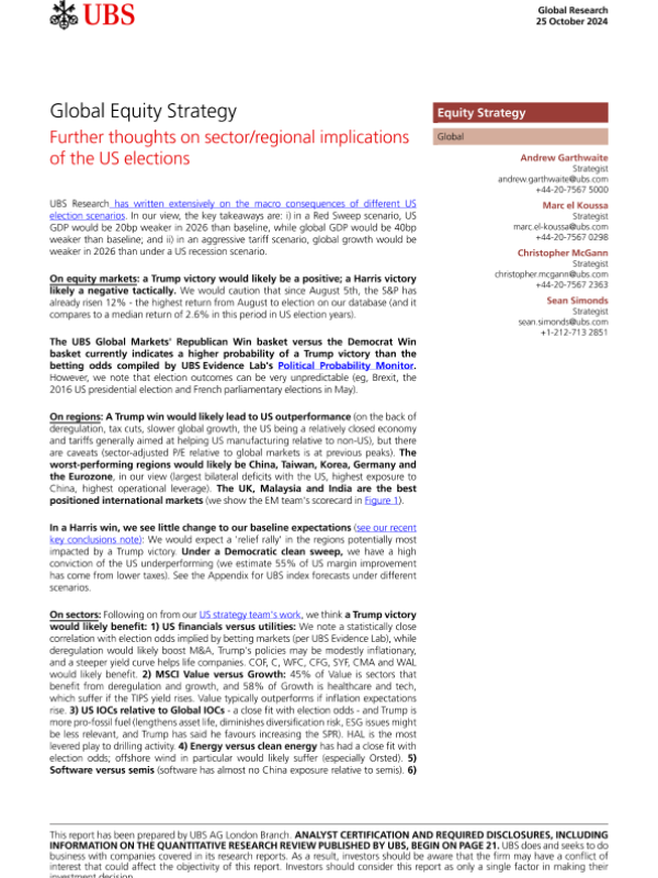 【UBS Research】【20241025】Global Equity Strategy Further thoughts on sector/regional implications of the US elections-28页 宏观策略