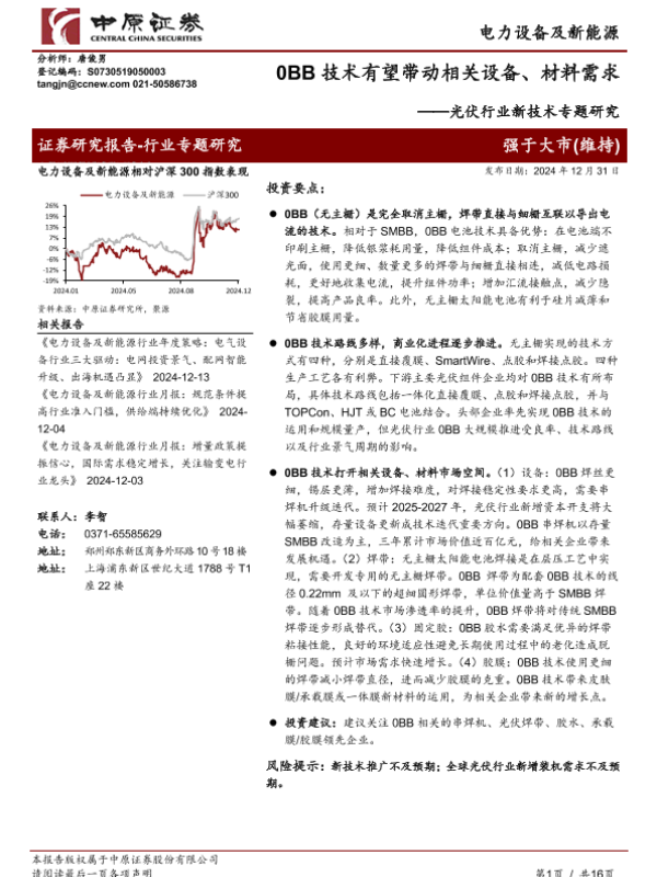 【中原证券】【20241231】光伏行业新技术专题研究:0BB技术有望带动相关设备、材料需求-16页 行业研究
