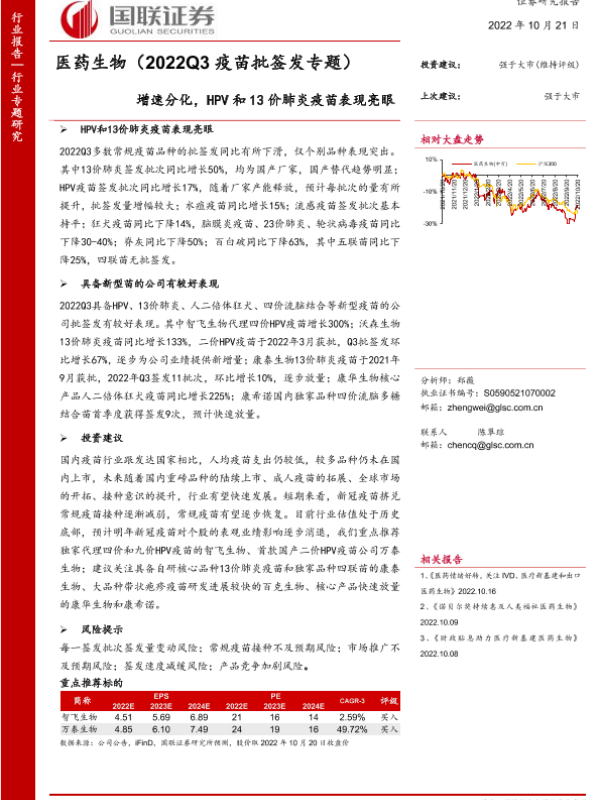 【国联证券】【20221021】医药生物行业(2022Q3疫苗批签发专题):增速分化,HPV和13价肺炎疫苗表现亮眼-33页 行业研究