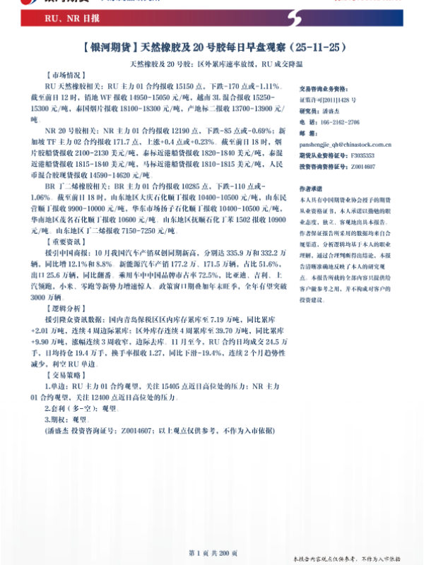 【银河期货】【202511】天然橡胶及20号胶每日早盘观察-200页 证券期货研究报告