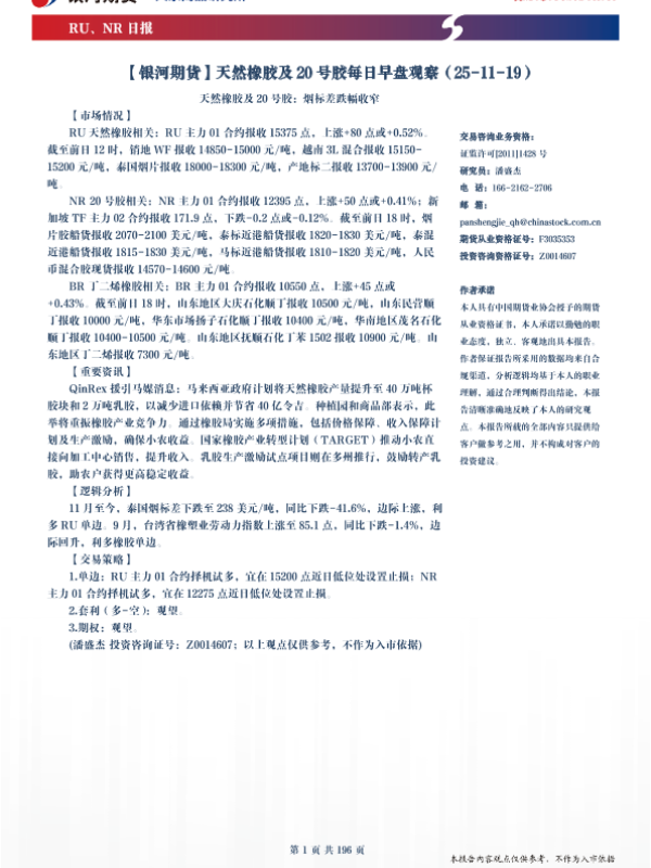【银河期货】【202511】天然橡胶及20号胶每日早盘观察-196页 证券期货研究报告