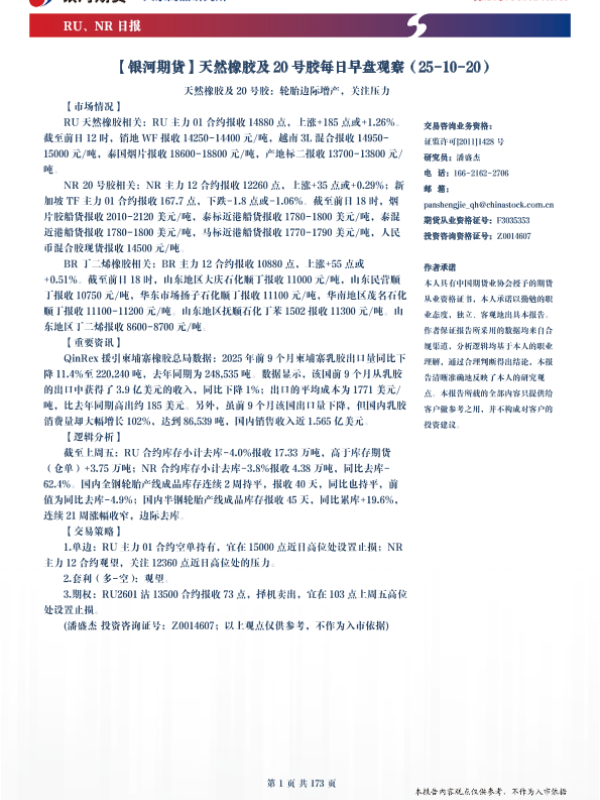 【银河期货】【202510】天然橡胶及20号胶每日早盘观察-173页 证券期货研究报告