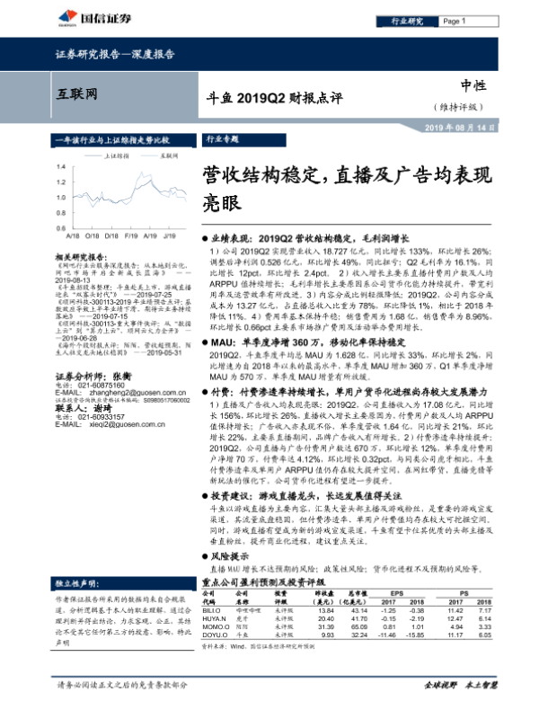 【国信证券】【20190814】互联网:斗鱼2019Q2财报点评:营收结构稳定,直播及广告均表现亮眼-8页 行业研究
