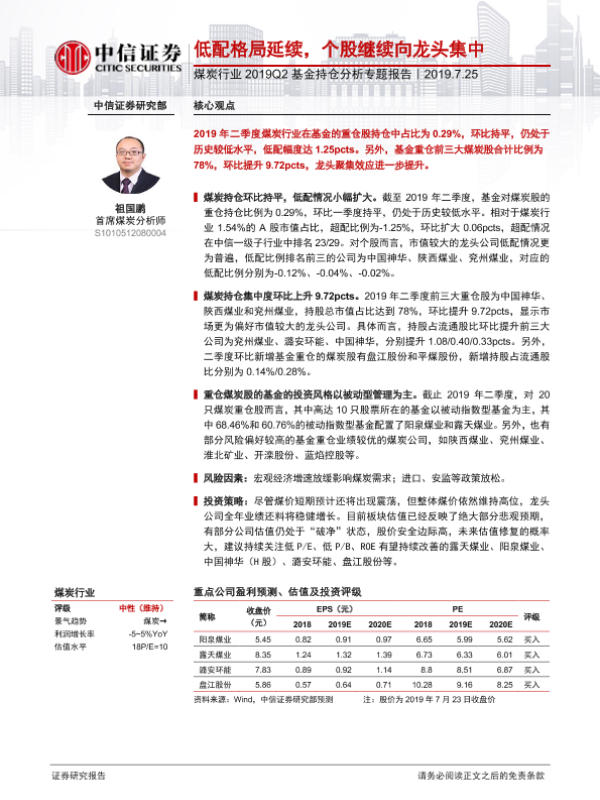 【中信证券】【20190725】煤炭行业2019Q2基金持仓分析专题报告:低配格局延续,个股继续向龙头集中-9页 行业研究