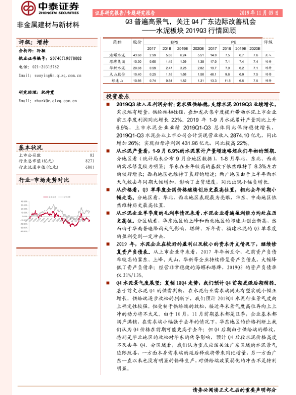 【中泰证券】【20191109】水泥板块2019Q3行情回顾:Q3普遍高景气,关注Q4广东边际改善机会-15页 行业研究