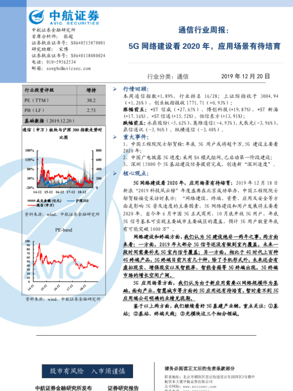 【中航证券】【20191220】通信行业周报:5G网络建设看2020年,应用场景有待培育-3页 行业研究