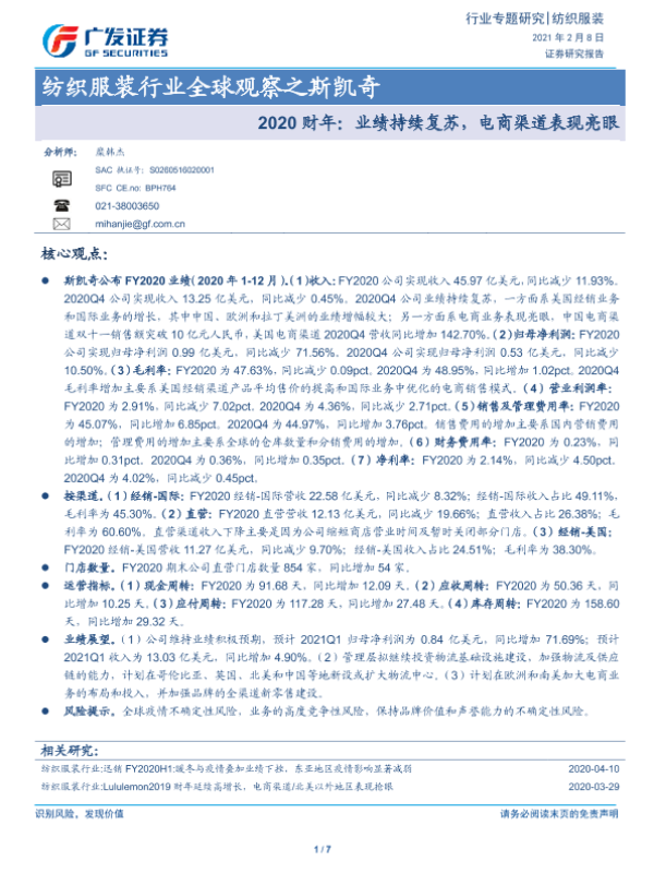 【广发证券】【20210208】纺织服装行业全球观察之斯凯奇:2020财年:业绩持续复苏,电商渠道表现亮眼-7页 行业研究
