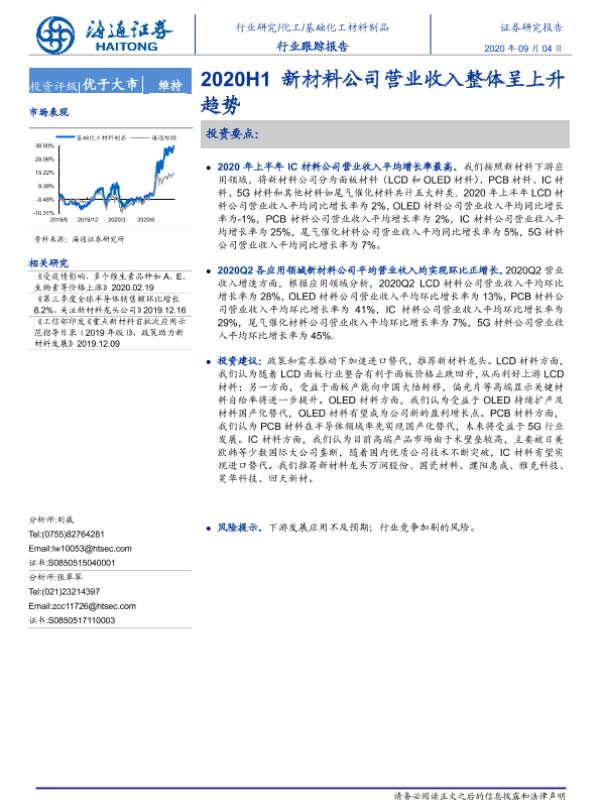 【海通证券】【20200904】基础化工材料制品行业跟踪报告:2020H1新材料公司营业收入整体呈上升趋势-10页 行业研究