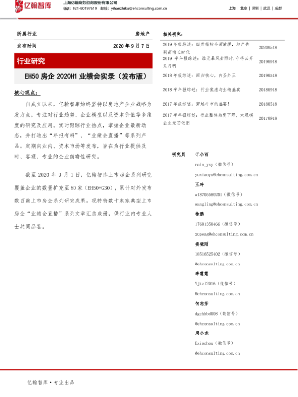【亿翰智库】【20200907】EH50房企2020H1业绩会实录-37页 行业研究