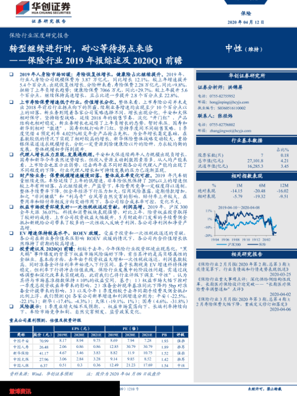 【华创证券】【20200412】保险行业2019年报综述及2020Q1前瞻:转型继续进行时,耐心等待拐点来临-23页 行业研究