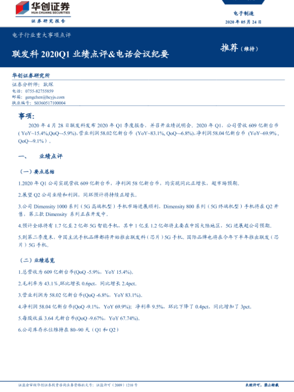 【华创证券】【20200524】20200524-华创证券-电子行业重大事项点评:联发科2020Q1业绩点评&电话会议纪要-10页 行业研究