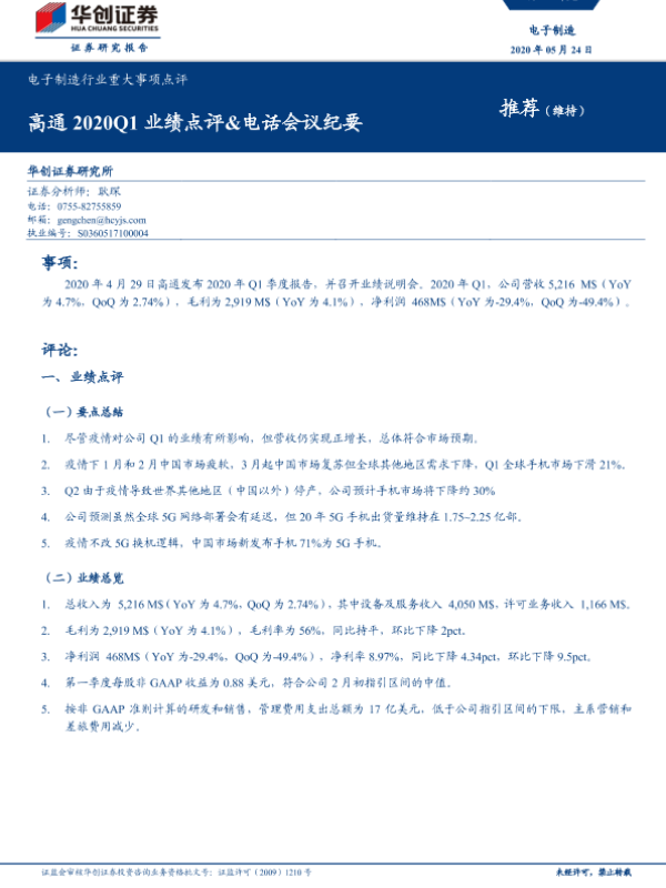 【华创证券】【20200524】20200524-华创证券-电子制造行业重大事项点评:高通2020Q1业绩点评&电话会议纪要-12页 行业研究