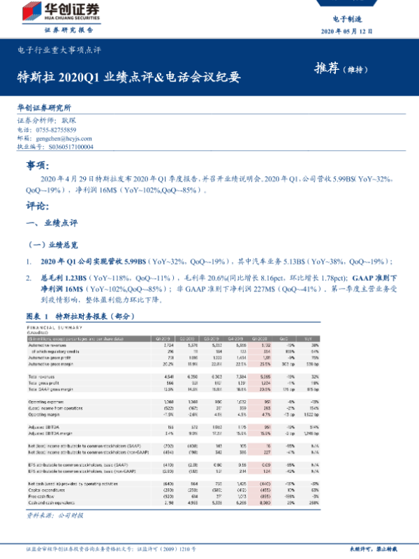 【华创证券】【20200512】20200512-华创证券-电子制造行业重大事项点评:特斯拉2020Q1业绩点评&电话会议纪要-11页 行业研究