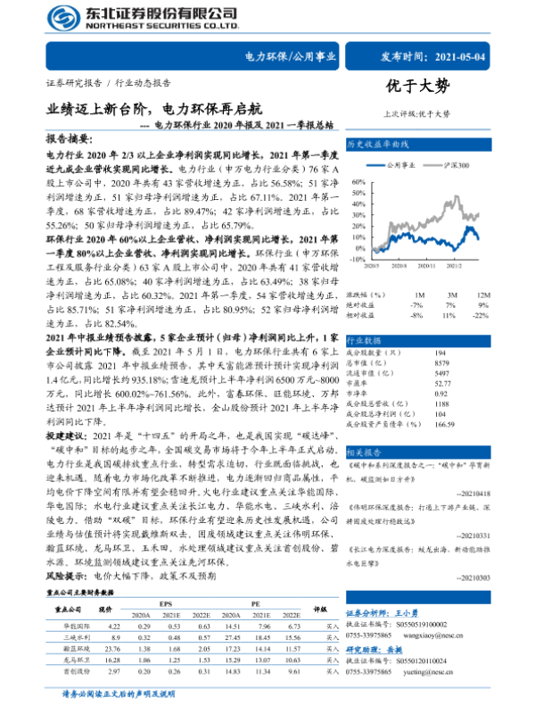 【东北证券】【20210504】电力环保行业2020年报及2021一季报总结:业绩迈上新台阶,电力环保再启航-72页 行业研究