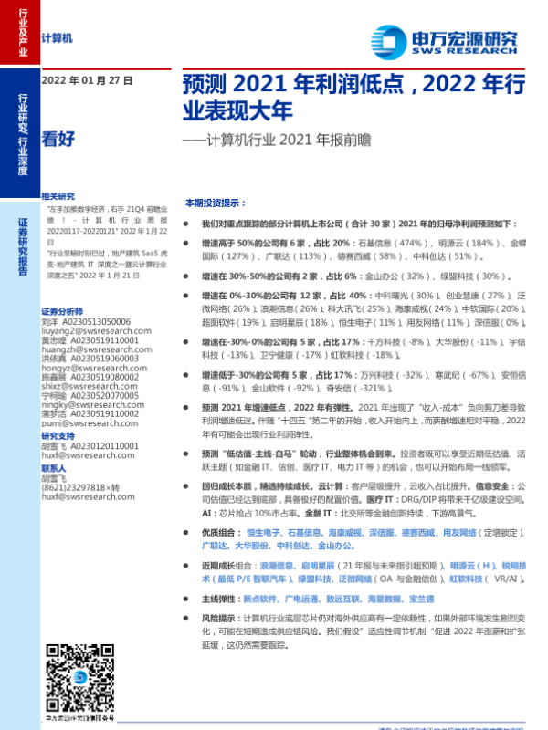 【申万宏源】【20220127】计算机行业2021年报前瞻:预测2021年利润低点,2022年行业表现大年-20页 行业研究