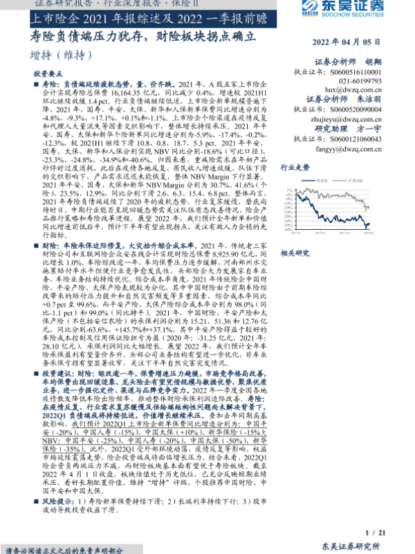 【东吴证券】【20220405】保险行业上市险企2021年报综述及2022一季报前瞻:寿险负债端压力犹存,财险板块拐点确立-21页 行业研究