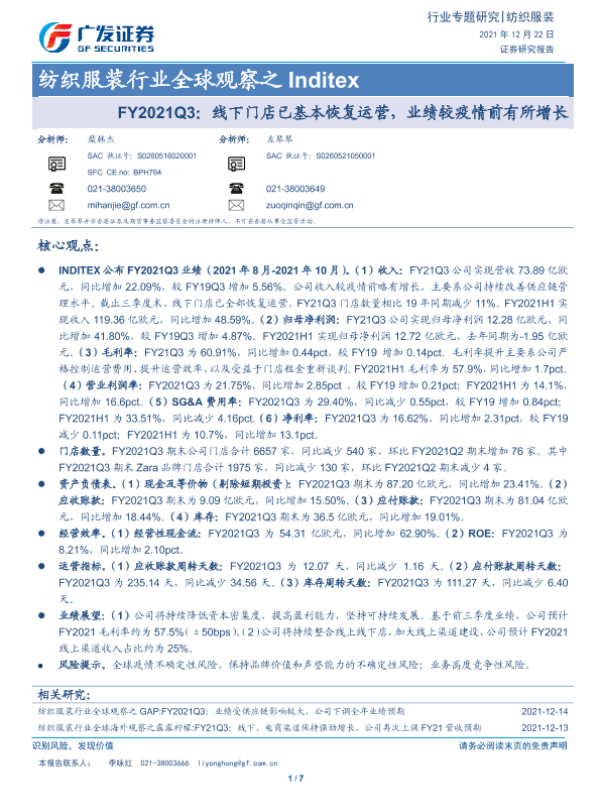 【广发证券】【20211222】纺织服装行业全球观察之 Inditex:FY2021Q3:线下门店已基本恢复运营,业绩较疫情前有所增长-7页 行业研究