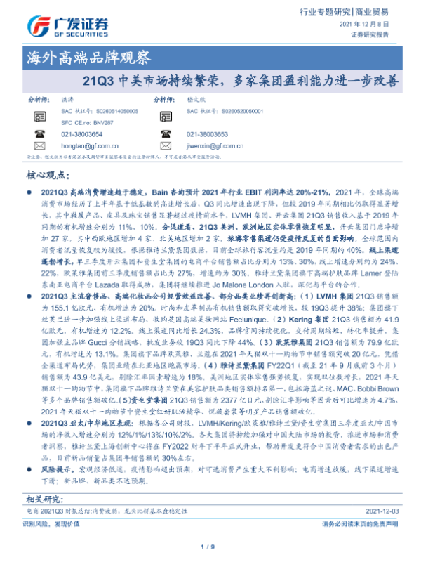 【广发证券】【20211208】海外高端品牌观察:21Q3中美市场持续繁荣,多家集团盈利能力进一步改善-9页 行业研究