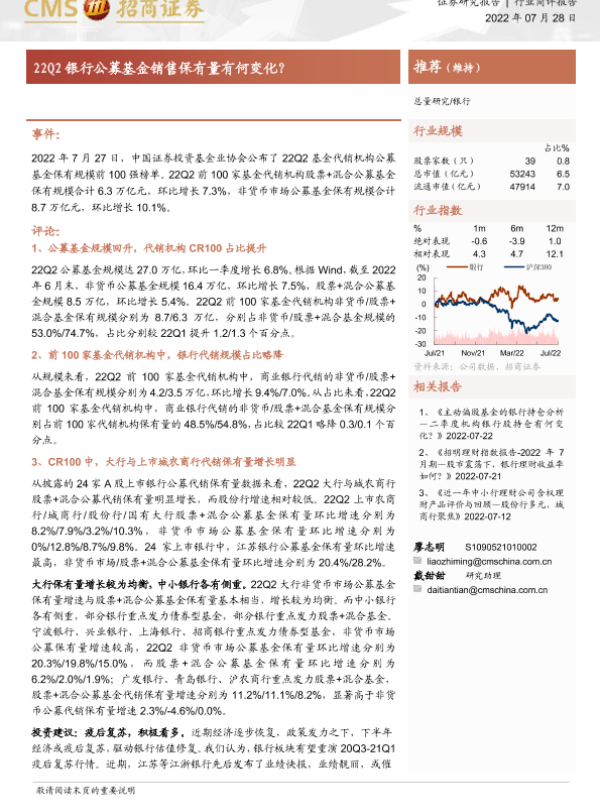 【海通证券】【20220728】银行业:22Q2银行公募基金销售保有量有何变化?-5页 行业研究