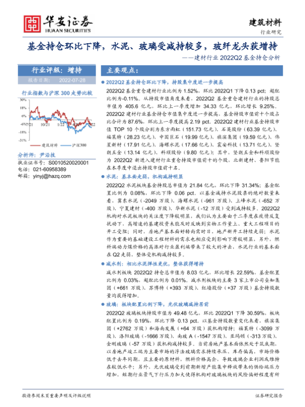 【华安证券】【20220728】建材行业2022Q2基金持仓分析:基金持仓环比下降,水泥、玻璃受减持较多,玻纤龙头获增持-19页 行业研究