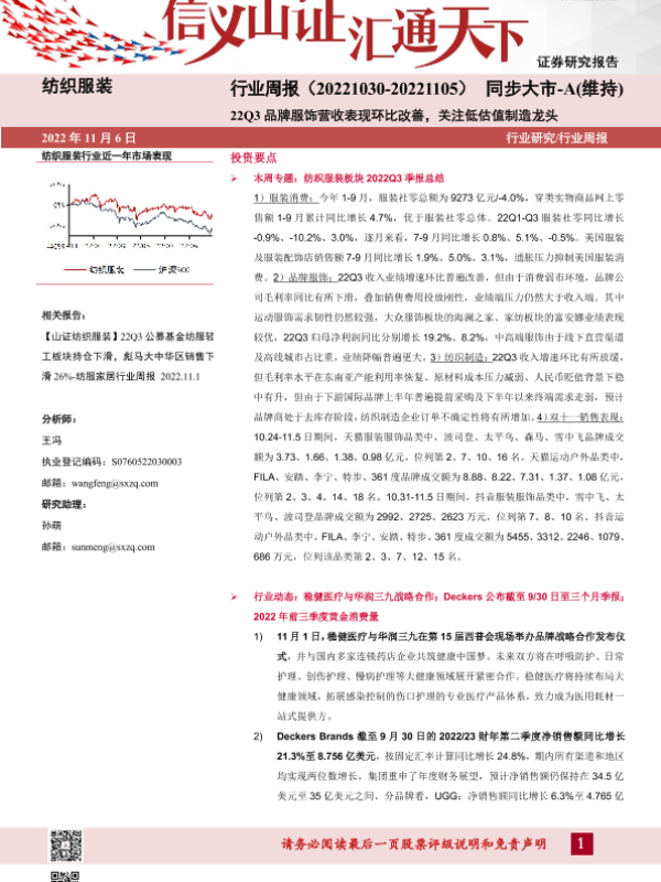 【山西证券】【20221106】纺织服装行业周报:22Q3品牌服饰营收表现环比改善,关注低估值制造龙头-28页 行业研究