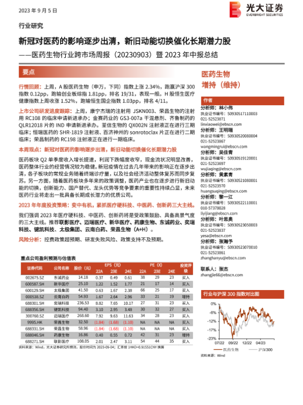 【光大证券】【20230905】医药生物行业跨市场周报暨2023年中报总结-31页 行业研究