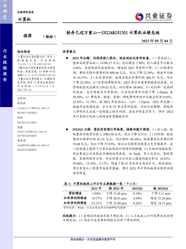 【兴业证券】【20230504】20230504-兴业证券-计算机行业跟踪报告:轻舟已过万重山--2022A&2023Q1 计算机业绩总结-14页 行业研究